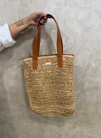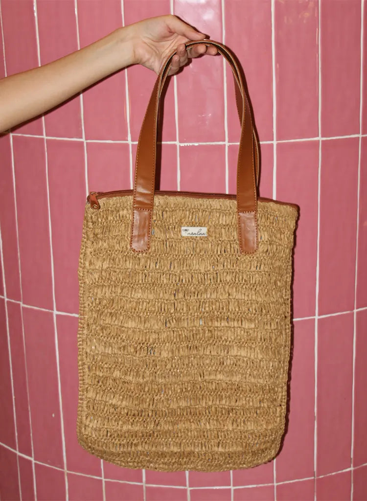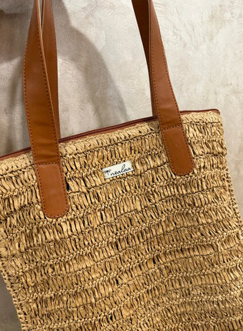 <p>"The Raffia Zipper Bag is a refined take on the classic woven bag— crafted with natural raffia fibers and designed with clean lines for timeless appeal. Its structured silhouette is elevated with sleek tan faux leather straps, cotton lining and a secure zipper closure, making it as practical as it is stylish. Spacious enough to carry your daily essentials—laptop, books, or weekend must-haves—this tote is your perfect companion for both workdays and casual outings. Lightweight yet durable, it embodies the effortless charm of nature paired with modern functionality."</p>