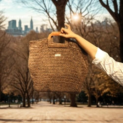 The Raffia Coffee Tote is a celebration of craftsmanship and style—handwoven from natural plant fibers and finished with a rich coffee-brown hue that brings warmth and sophistication to your look. Its striking square wooden handle adds a contemporary edge, making this tote as much a statement piece as it is a functional companion.